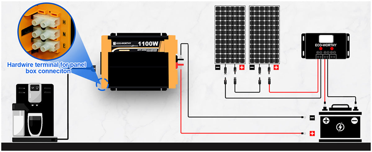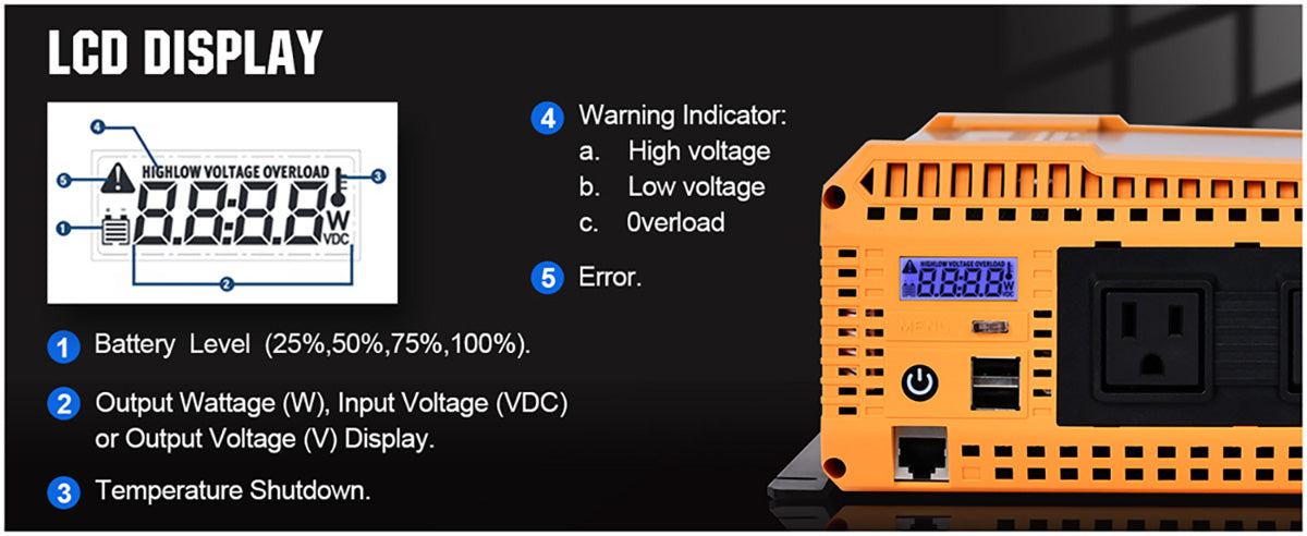 ·Visual and Easy to Use: With three outputs: 2*American standard sockets, 2*18W USB ports, 1*wiring blocks (Hardwire Terminals), and 1*External inverter display&Switch&16.4ft Extension cable to monitor various data: battery power, output power, battery voltage+output voltage, high temperature warning, high voltage warning, low voltage warning, overload warning.