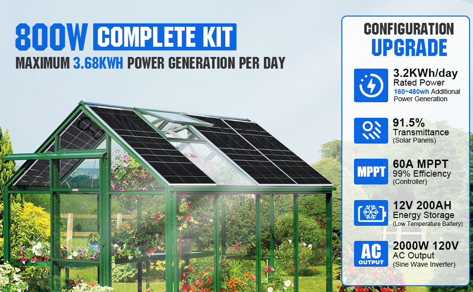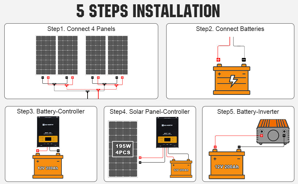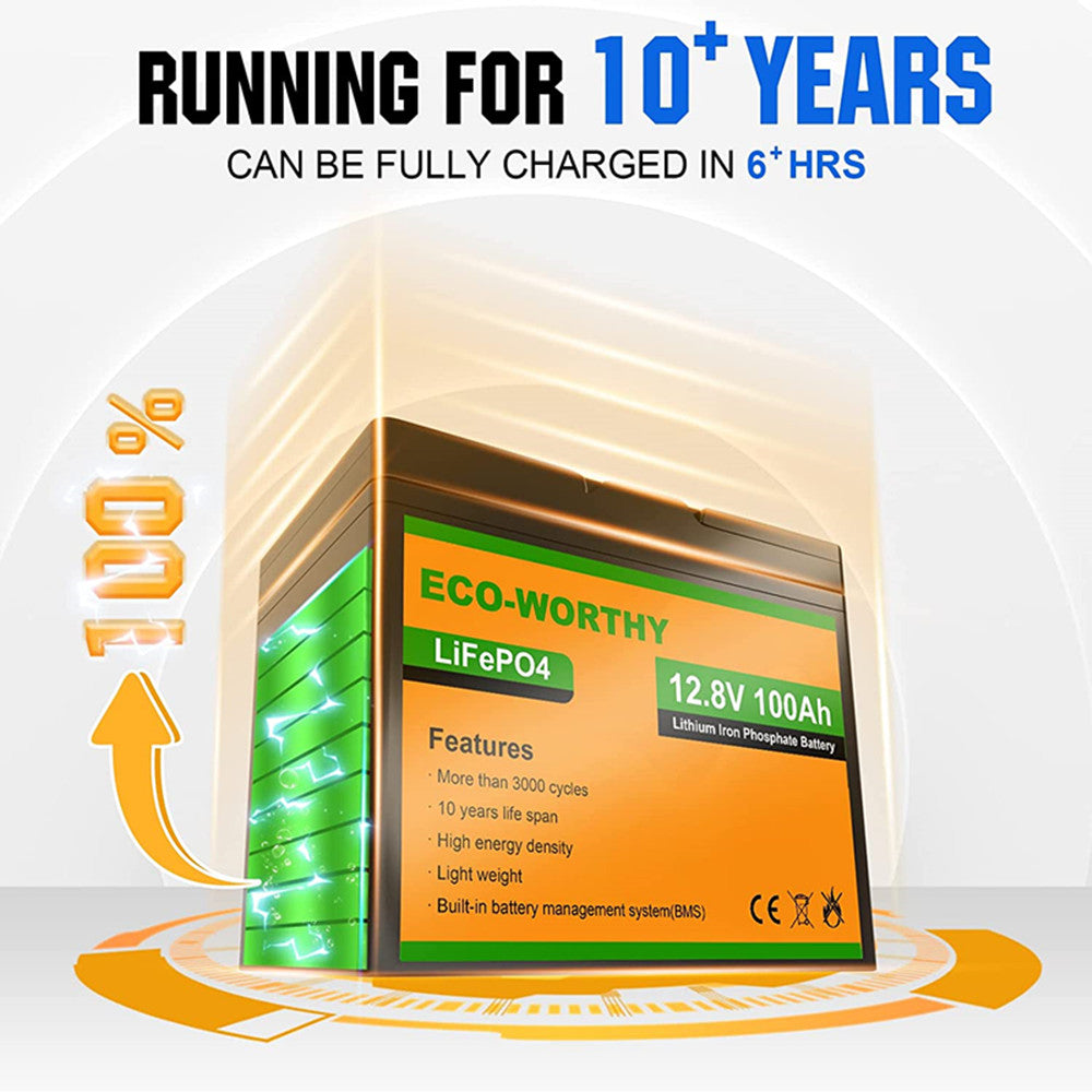 ECO-WORTHY 195 Watt 12V Mono solar panel is backed by 25-year linear power guarantee. ECO-WORTHY LiFePO4 Lithium Iron Phosphate Battery has twice the power, half the weight and lasts 8 times longer than a sealed lead acid battery.