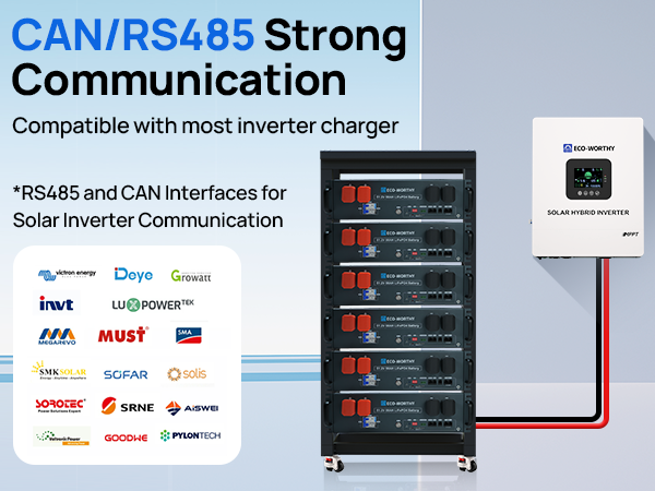 Smart Monitoring: Supports CAN/RS485/RS232 communications. Pre-loaded with multi-brand inverter protocols for grid/backup/off-grid modes. Real-time monitoring via Bluetooth & WiFi connections. Access battery status through mobile apps or PC software.