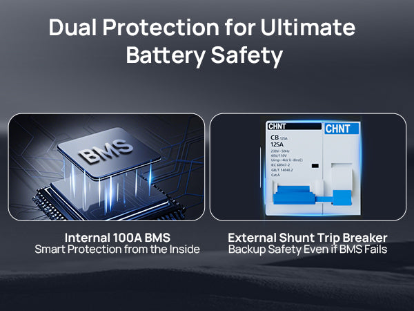Robust Safety Features: Durable full metal casing, integrated 100A BMS with low-temperature protection,comprehensive protection (overcharge, over-discharge, over-current, short circuit, and over-temperature), plus a 125A air switch and power switch for added safety.