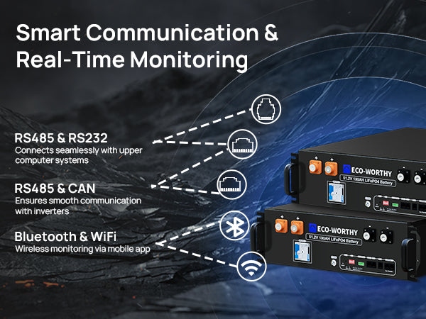Smart Monitoring: Supports CAN/RS485 for seamless communication with popular all-in-one solar inverters.You can easily monitor your battery’s status through the mobile app, which supports both Bluetooth and WiFi connections. Stay informed on your battery’s health and performance in real-time