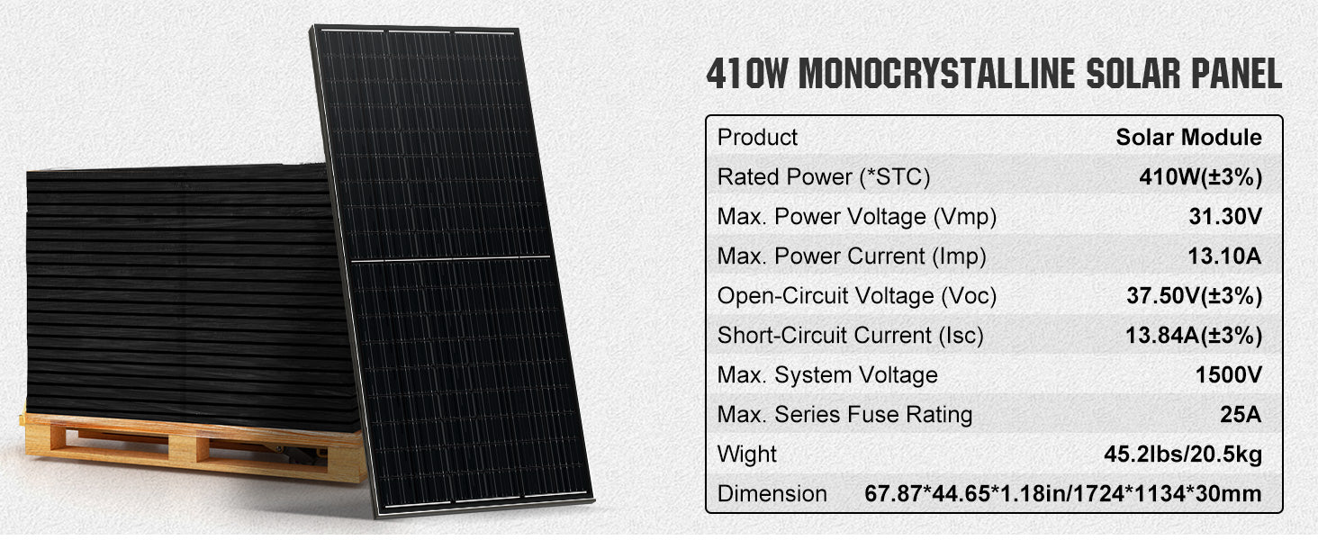 [410W High Power Solar Panel] 410W Mono-crystalline Solar Panel (Black). Low power loss in cell connection compared to conventional modules. Improved shading tolerance. Lower internal current, lower hot spot temperature. Heat-strengthened glass minimizes micro-crack impact. Full 25-year workmanship & linear power performance. warranty.