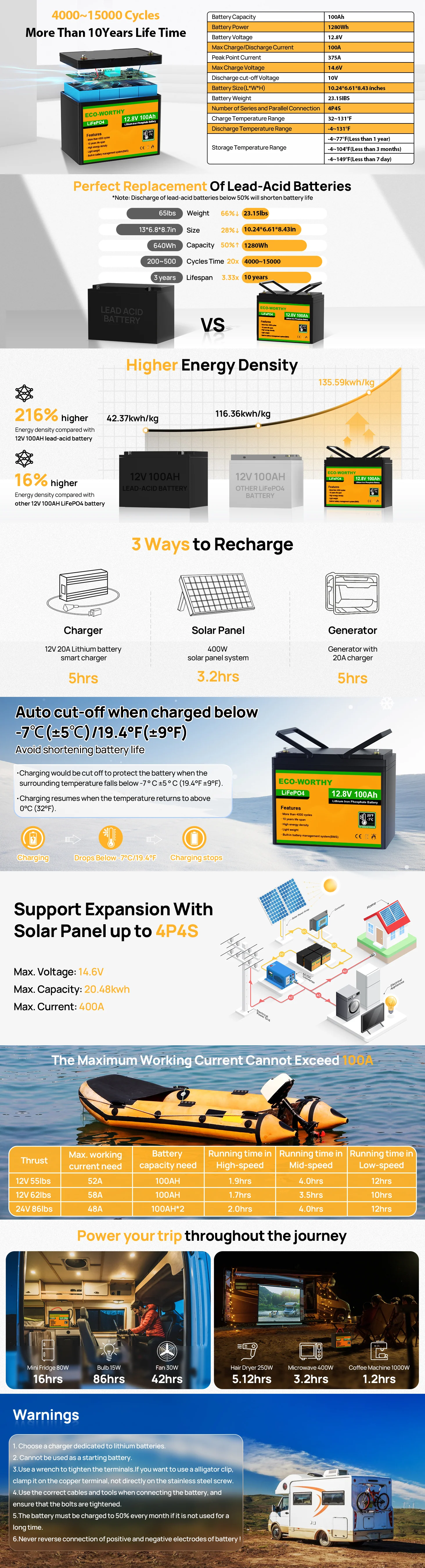 [4000-15000 Deep Cycles]: ECO-WORTHY 100AH lithium iron phosphate battery provides 4000-15000 times deep cycles, which is eight times than that of lead-acid batteries (300-400 times). The lifespan of each ECO-WORTHY LiFePO4 battery can reach 10 years