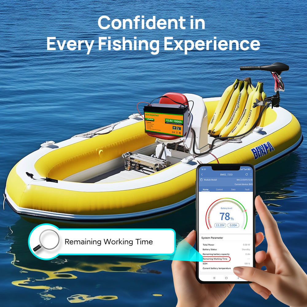 [Low-Temp Protection] This 12V 150Ah lithium trolling motor battery is equipped with low-temperature cut-off protection which automatically cuts off the battery from charging when the cell temperature is below -7℃(19.4℉) to prevent the battery cells from being damaged. Especially designed to ensure safe use for the low temperature charging environment in winter. Widely used for RV, cabin, off-grid or marine in cold winter.