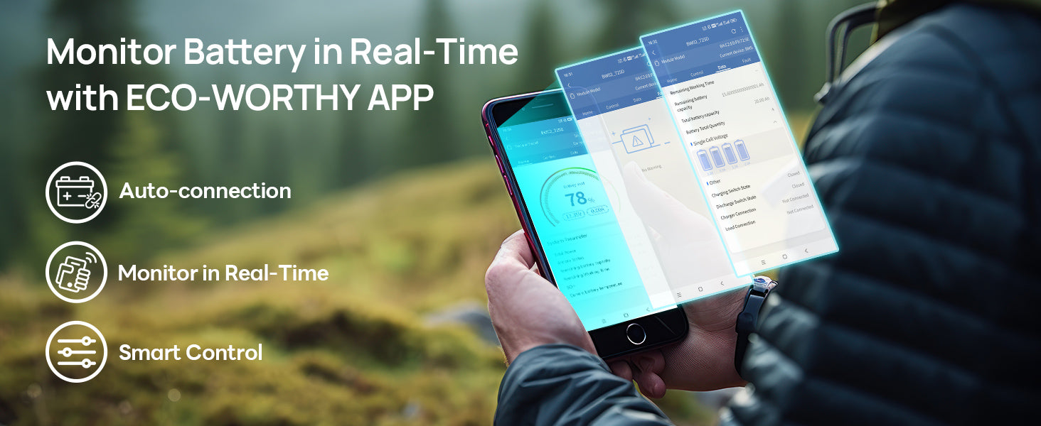 [4S4P, Easy Troubleshooting]ECO-WORTHY 100AH Lithium battery support 4S4P with 1.92kWh to Max. 30.72kWh so that you can easily DIY your battery system as you needs. If one of the batteries in the bank malfunctions, you can quickly identify the problem through the mobile app. Say goodbye to guesswork and complex troubleshooting. Perfect for RV, camping, solar, home energy storage, and so on.